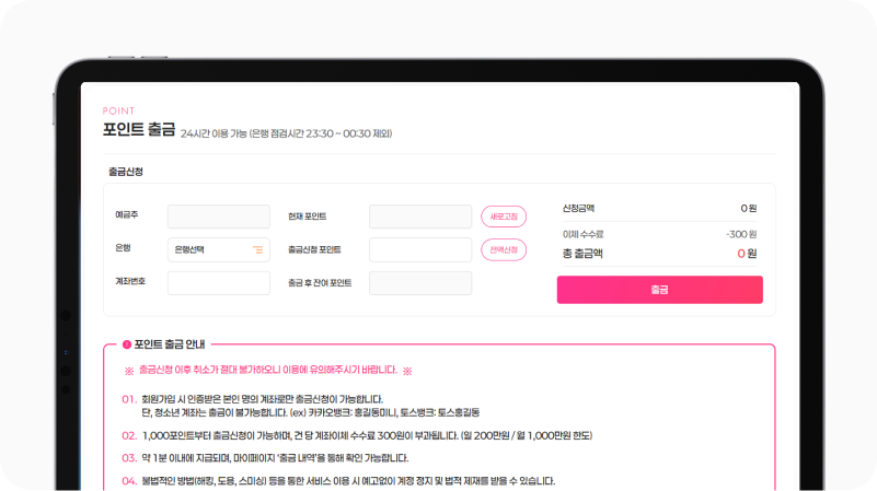 신청한 포인트가 빠른 시간 내에 입력한 계좌로 입금됩니다.